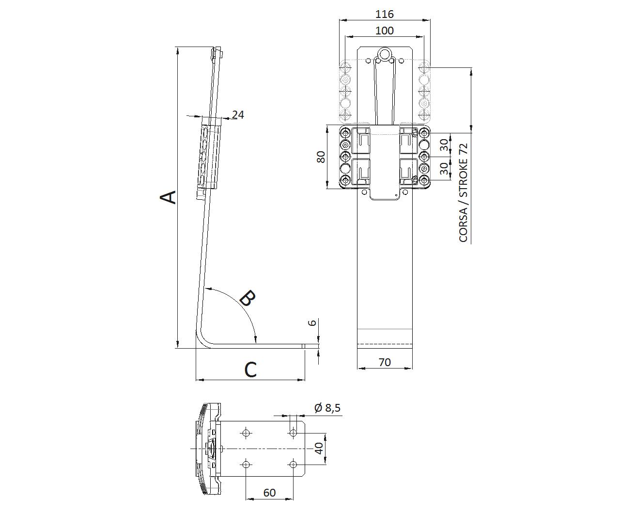 - Possibility to personalize height (A), angle (B), depth (C) - see drawing